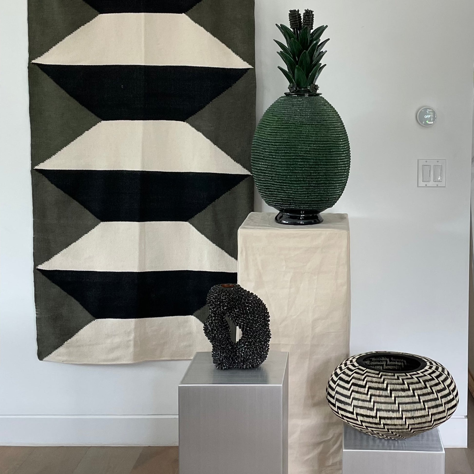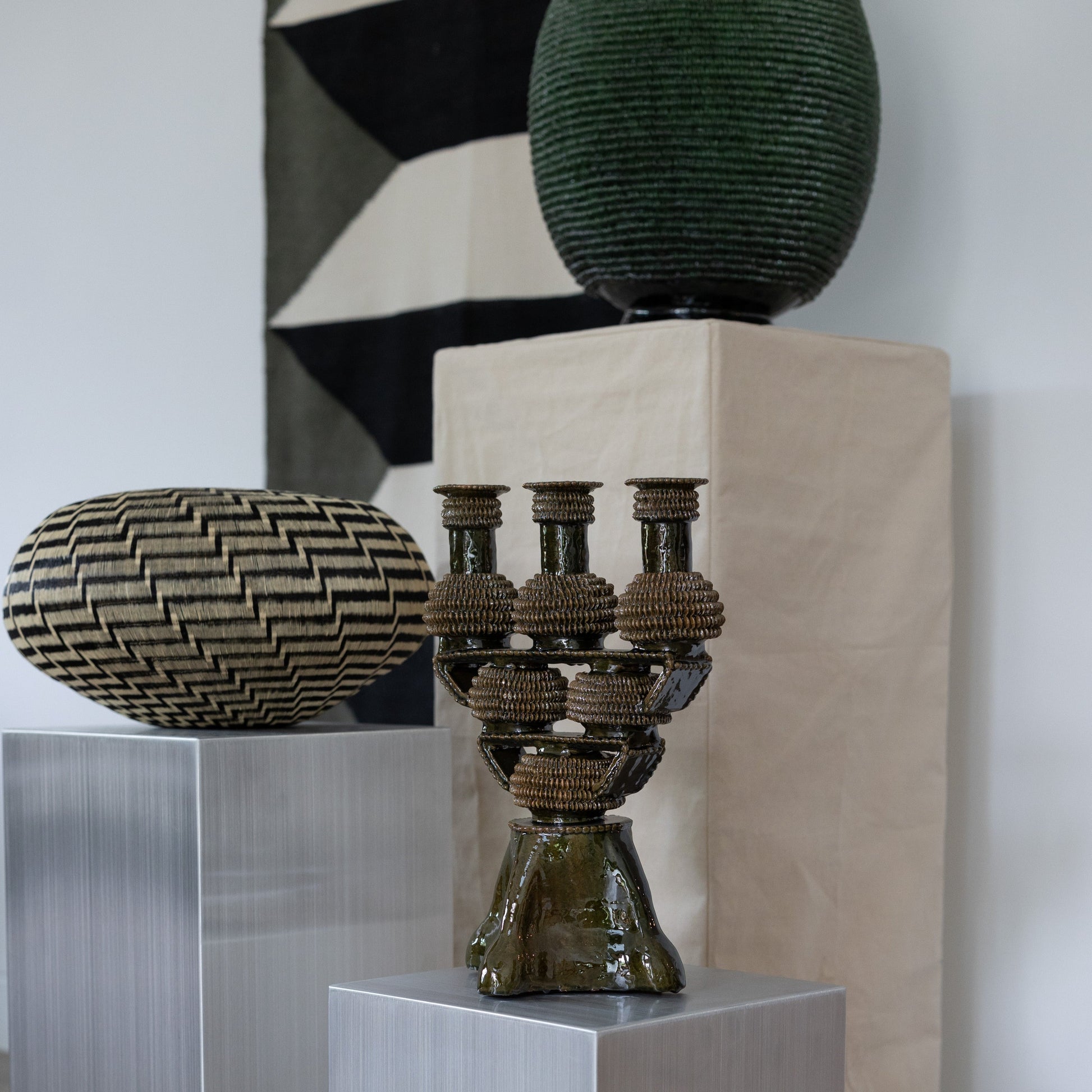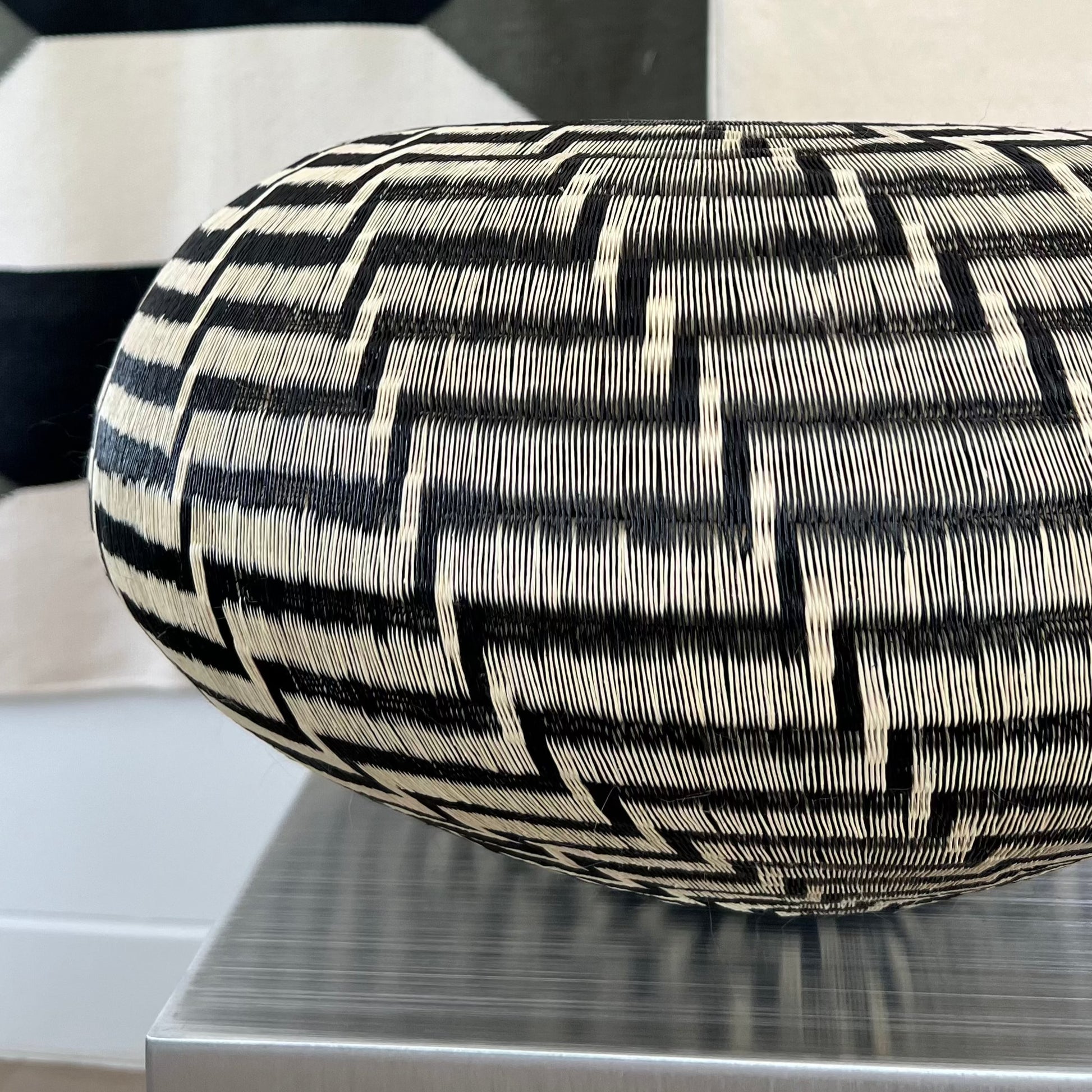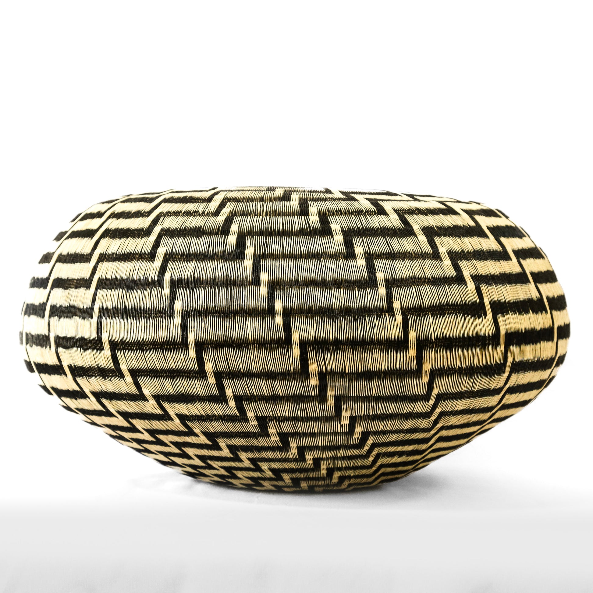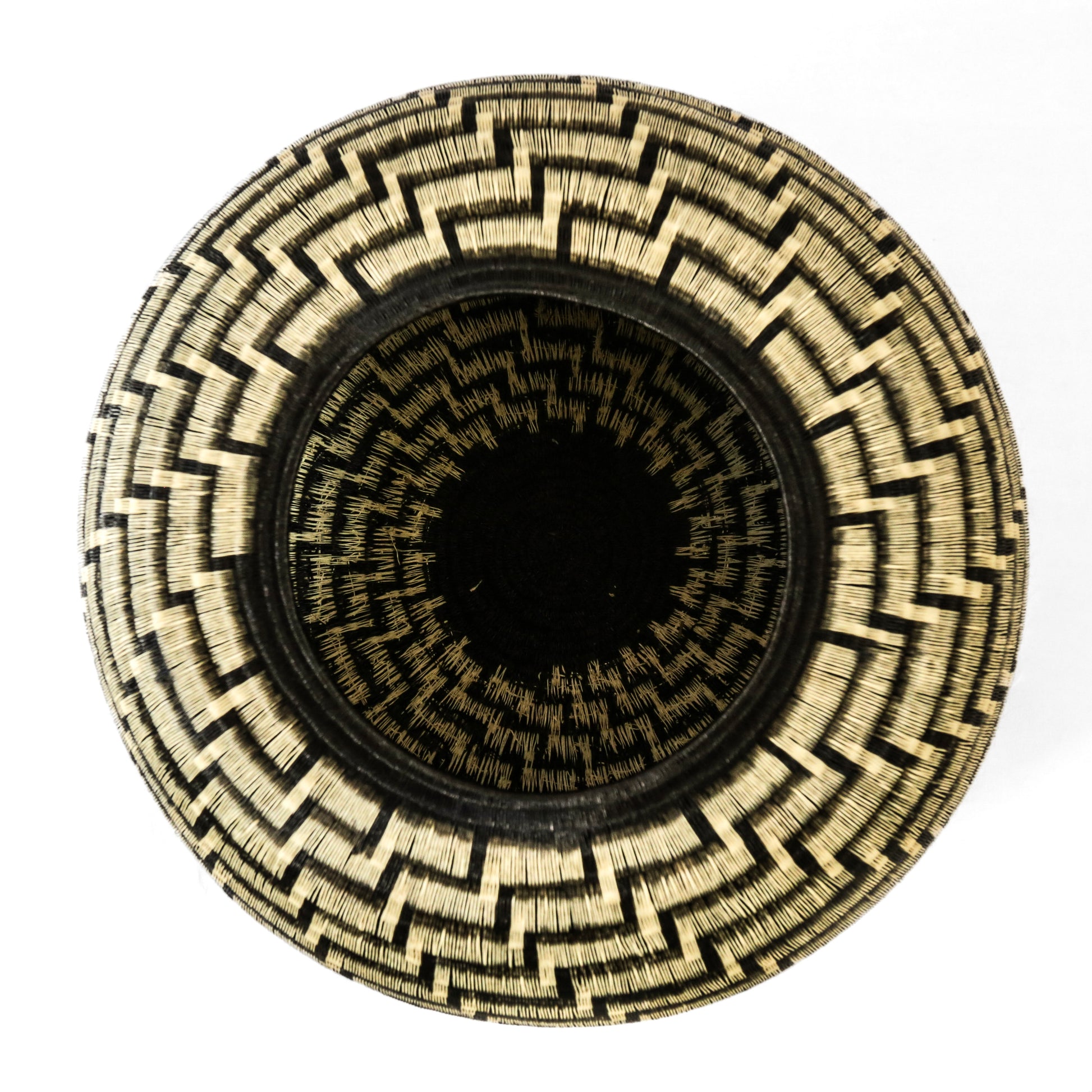 Decorative vase woven by Dioselino artisan from the Wounnan indigenous community of the pacific coast of Colombia. He called it "Stairs to heaven " which depicts a modern stepped design that grows in a spiral technique from the base.