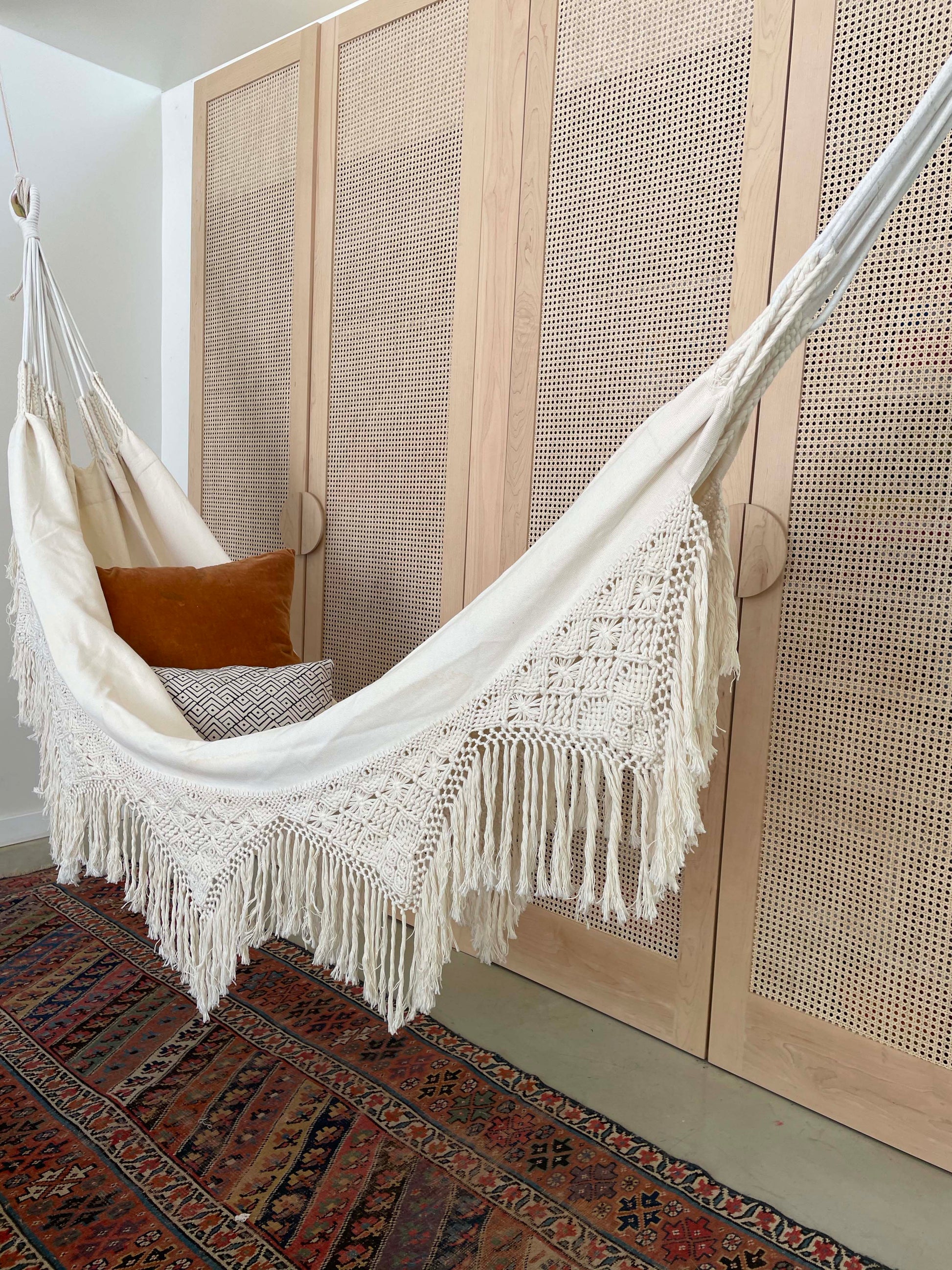 Traditional Handmade Colombian Hammock with macrame embroidery detail. This piece will enhance and give a sense of relaxation to any space. Use it indoors or outdoors.